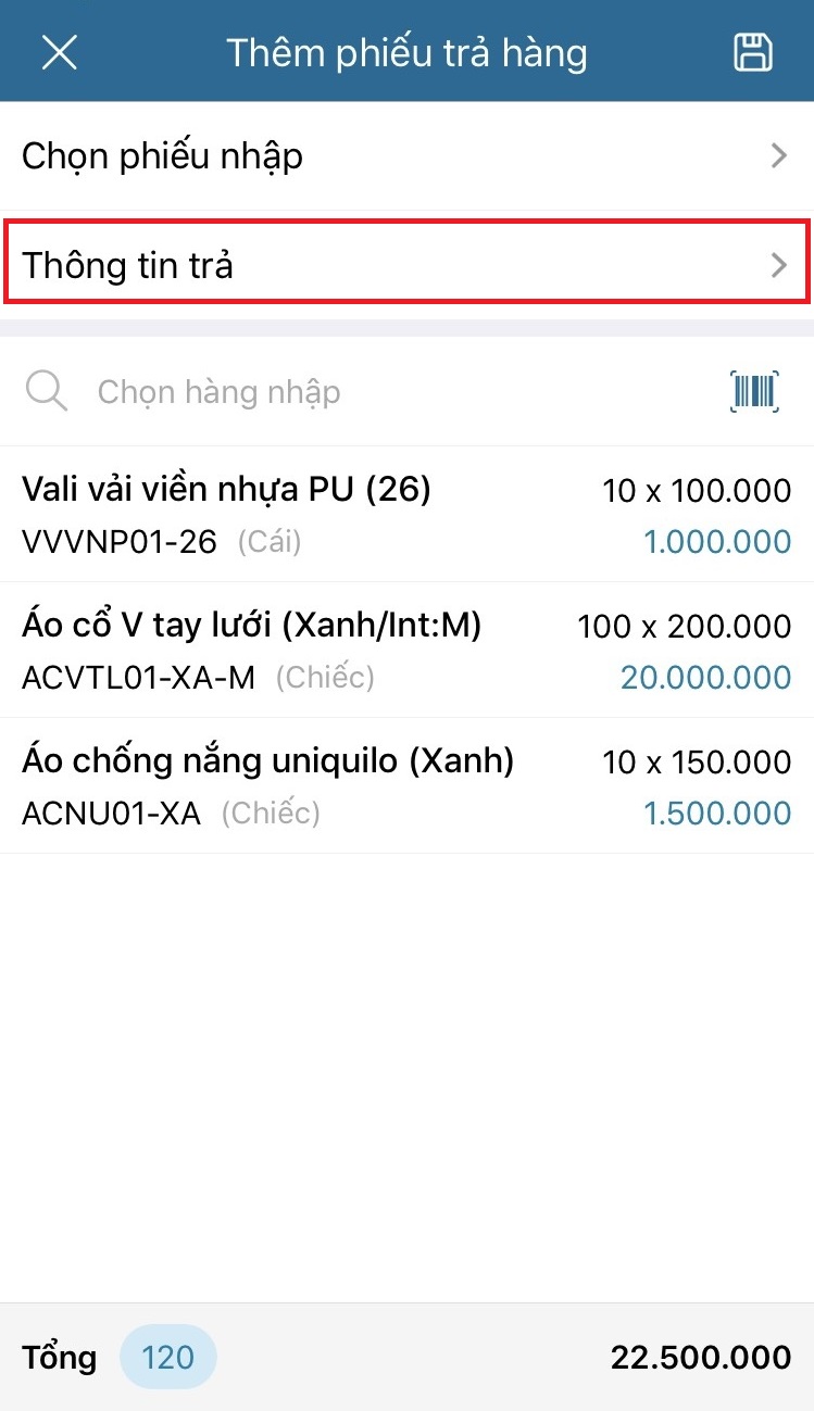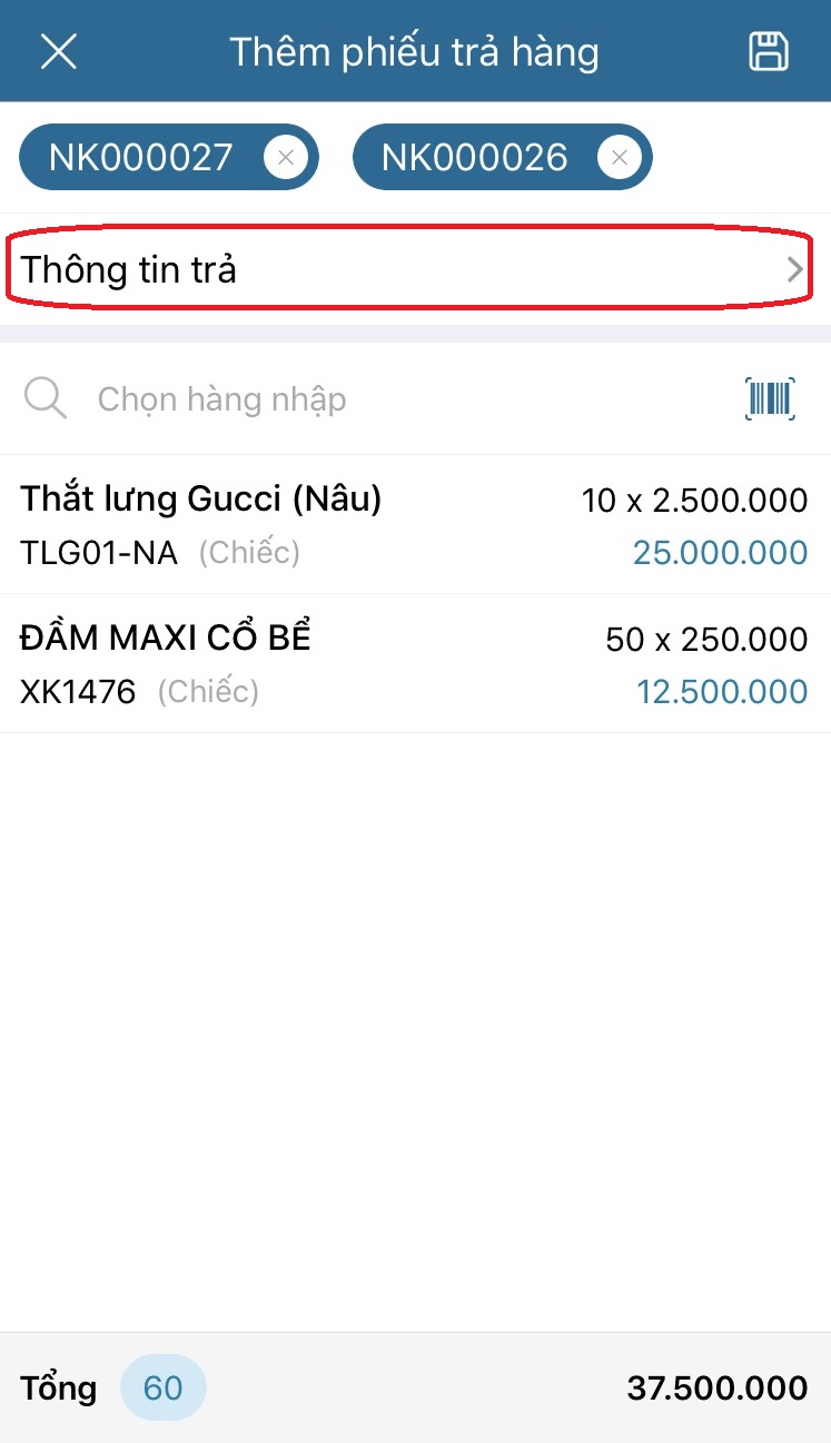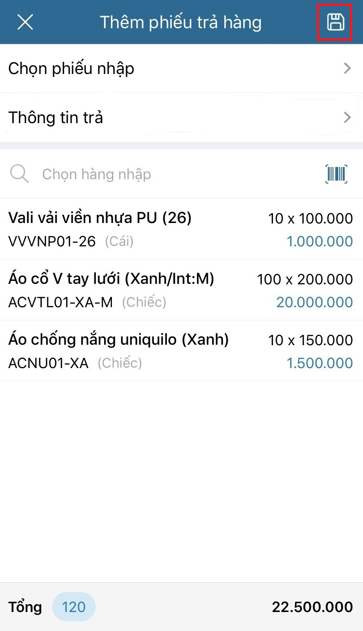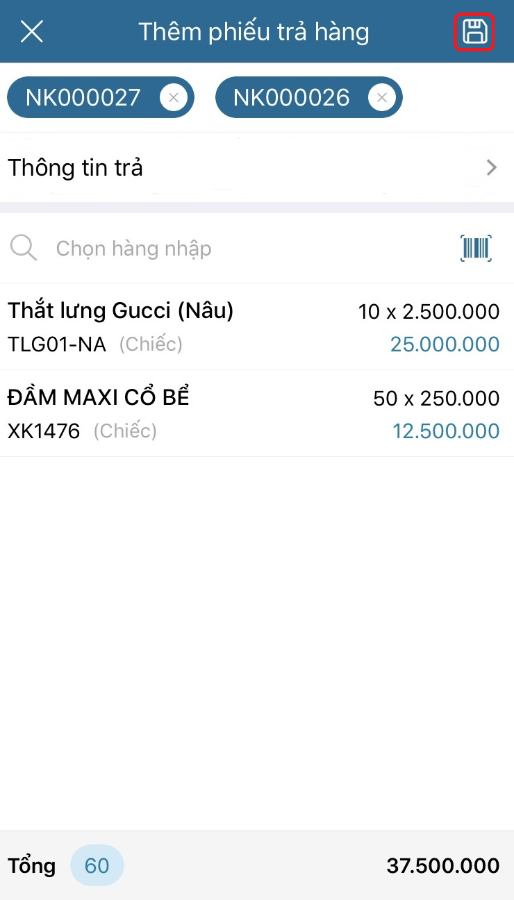 - Chọn Lưu lần nữa để lưu phiếu trả hàng.