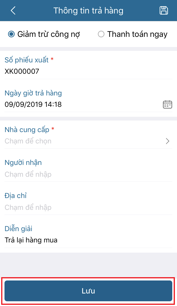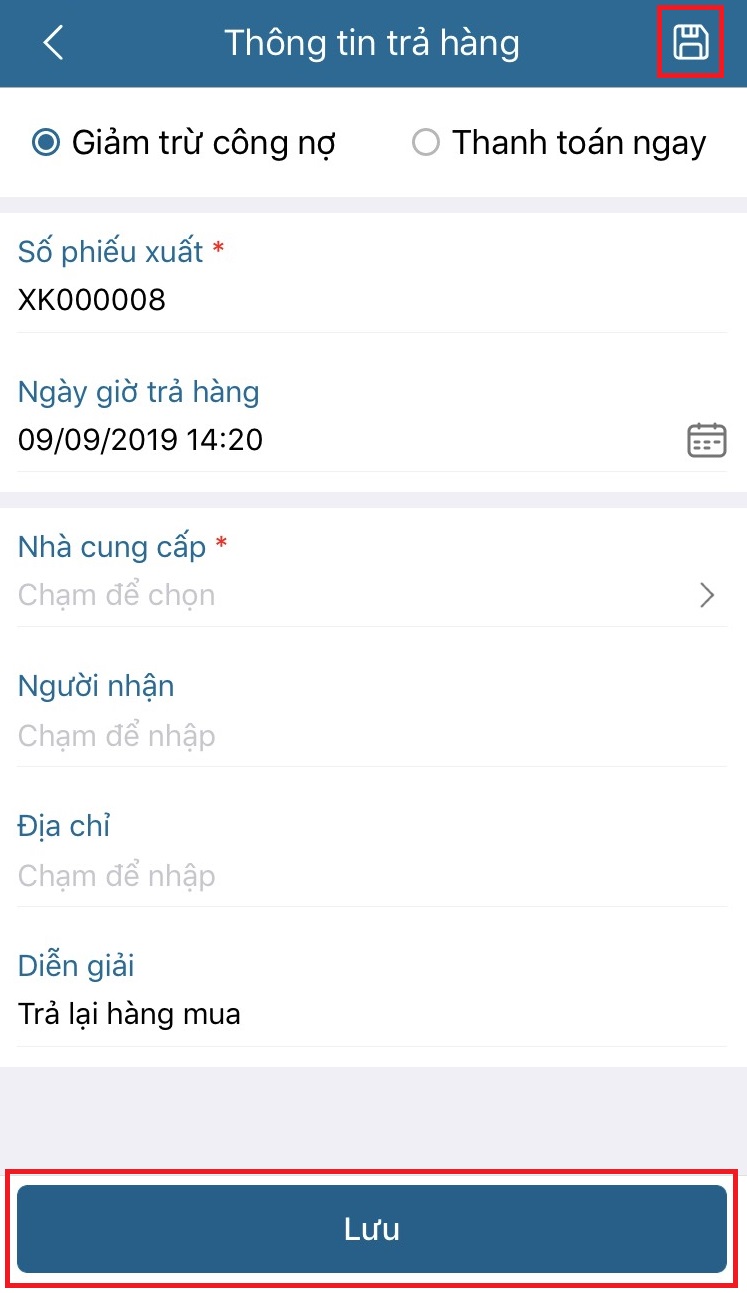 - Nhập các thông tin vào phiếu trả: Chọn Giảm trừ công nợ hoặc Thanh toán ngay bằng tiền mặt hoặc Thanh toán ngay bằng tiền gửi. Nhấn Lưu để lưu lại thông tin trả hàng.