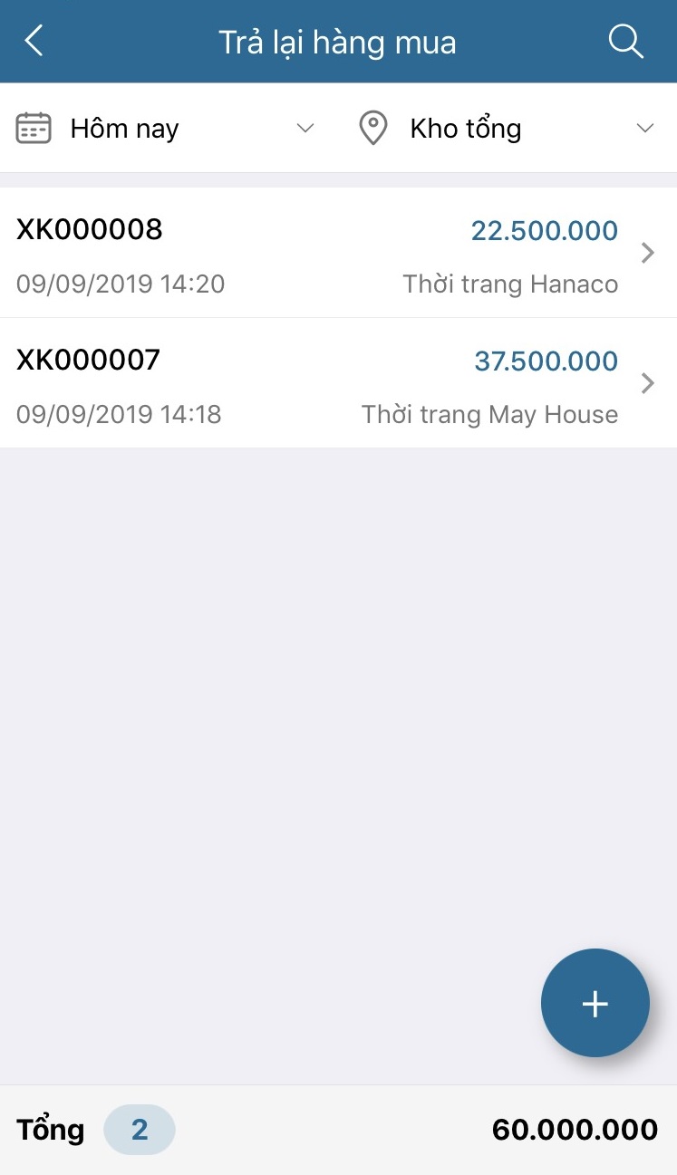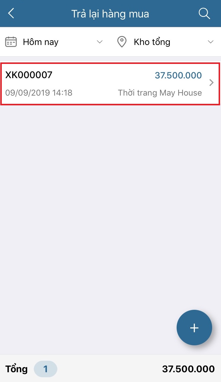 - Sau khi lưu lại thì phiếu trả lại hàng mua hiển thị trong danh sách phiếu :