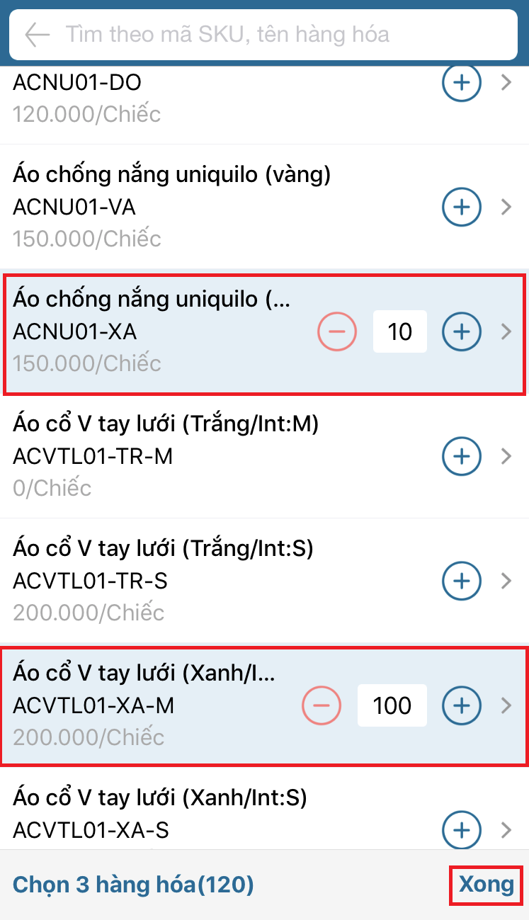 - Chọn hàng hóa và số lượng hàng hóa cần trả lại trong danh sách hàng hóa và chọn xong.