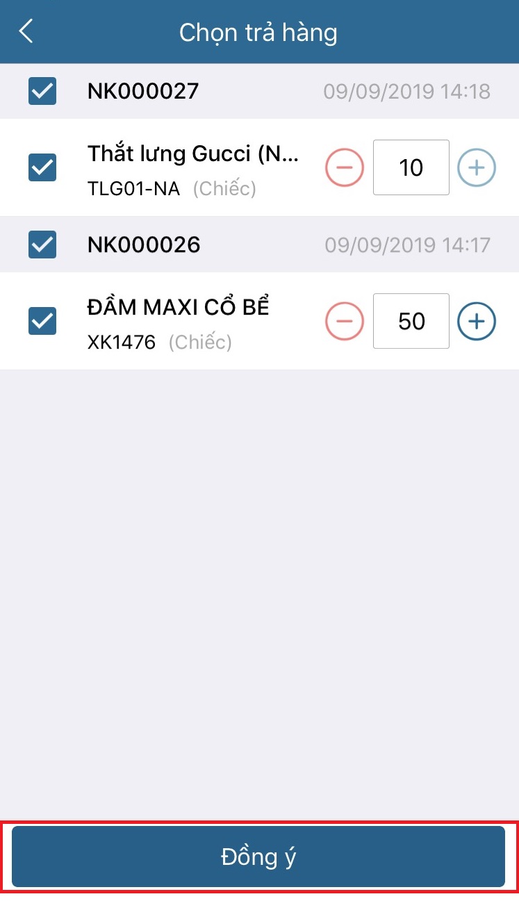 - Chọn số lượng hàng hóa cần trả lại và chọn Đồng ý