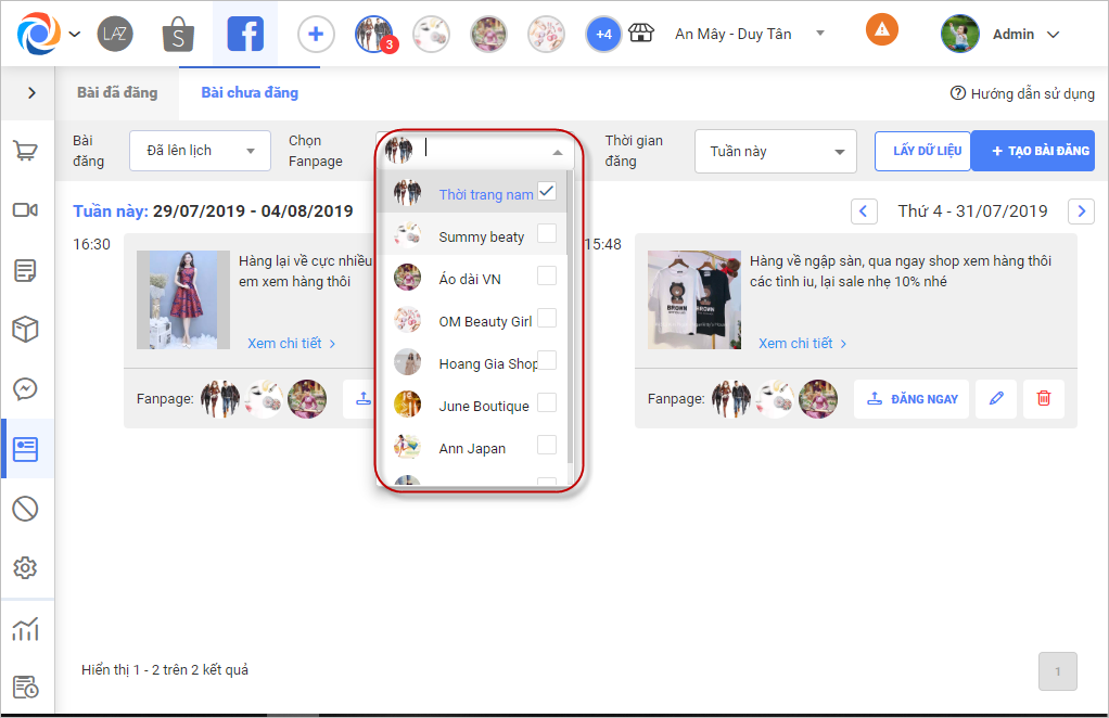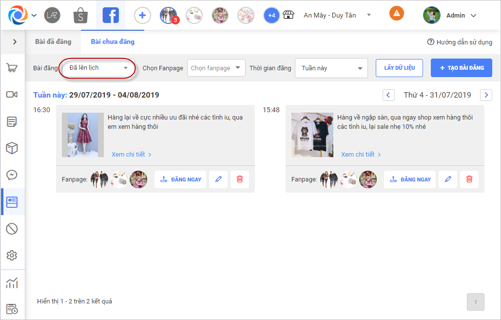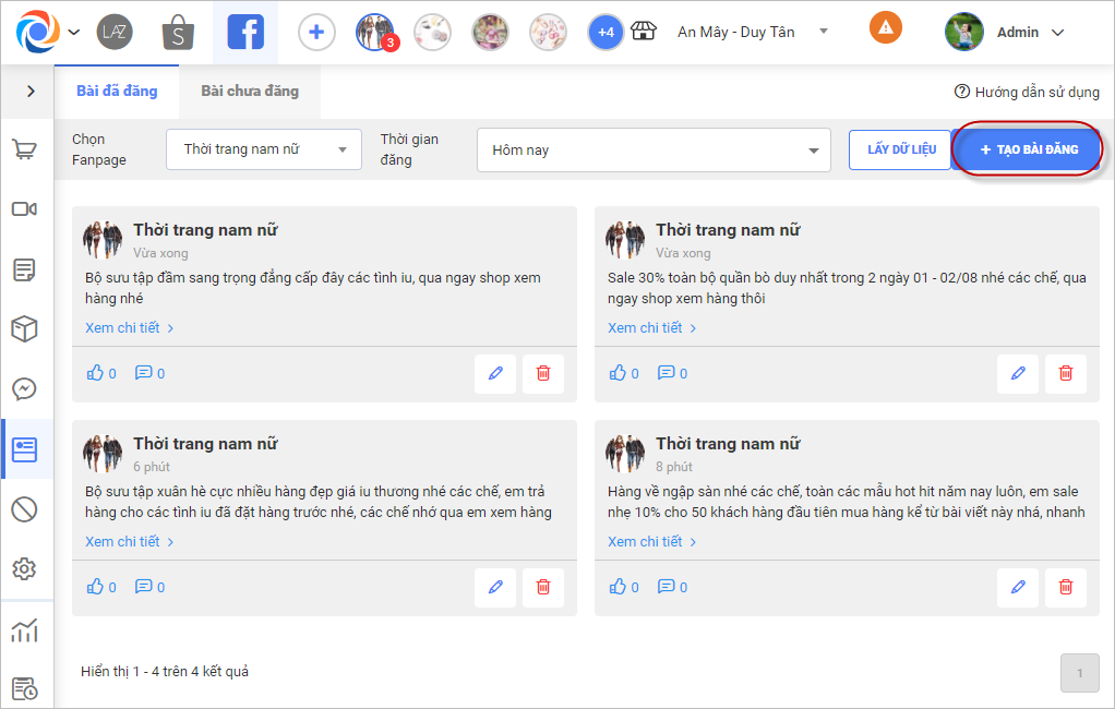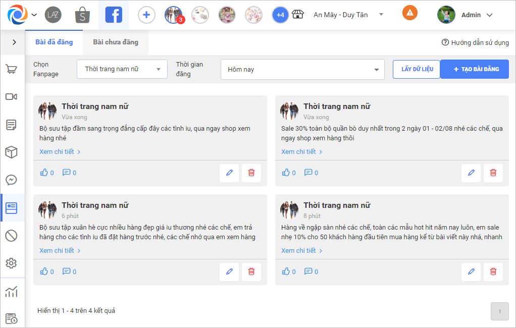 – Giúp chủ của hàng quản lý được các bài đăng trên facebook, báo cáo lượt tương tác/hội thoại của từng bài đăng. Bên cạnh đó cho phép soạn bài đăng mẫu, tạo lịch và chọn page để đăng lên facebook.