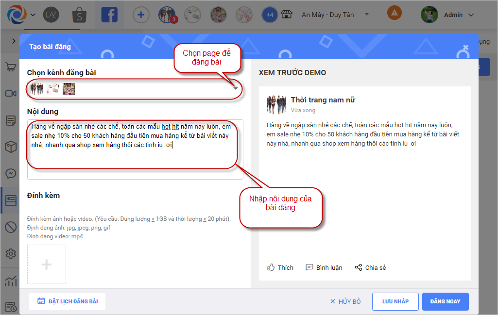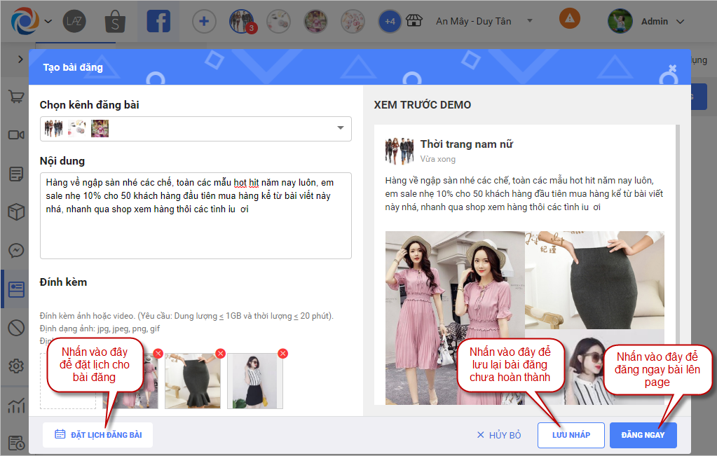 – Sau khi nhập các thông tin cần đăng nhấn chọn Đăng ngay để đăng ngay bài lên page đã chọn, chọn Lưu nháp để lưu lại bài đăng chưa hoàn thành hoặc nhấn Đặt lịch đăng bài để đặt lịch cho bài đăng