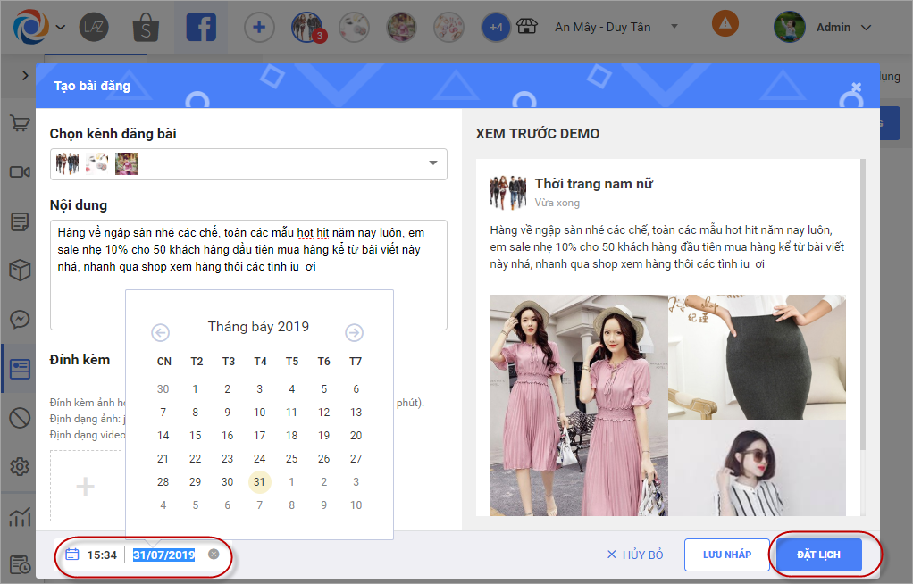 – Sau khi nhấn Đặt lịch đăng bài, chương trình sẽ hiển thị thời gian đặt lịch để người dùng lựa chọn, nhấn Đặt lịch sau khi đã cài đặt xong giờ chương trình tự động đăng bài