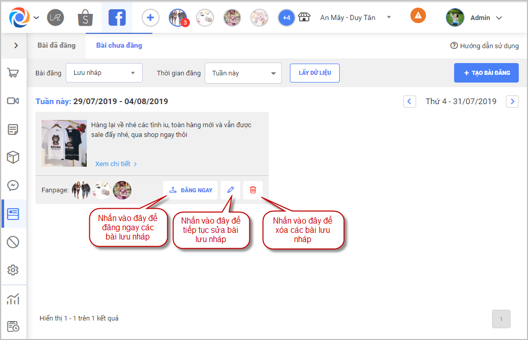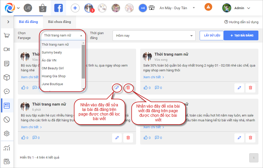 – Tại danh sách Bài đã đăng nhấn chọn Page để lọc tìm các bài viết đã được đăng lên page đang chọn, nhấn chọn sửa để sửa lại bài đã đăng trên page đang chọn hoặc nhấn xóa để xóa bài đăng trên page đang chọn