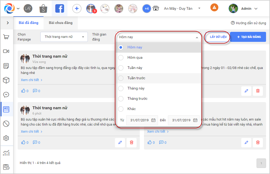 – Nhấn chọn combo Thời gian đăng để chọn khoảng thời gian cần lọc tìm bài đăng, nhấn Lấy dữ liệu tìm kiếm bài đã đăng thỏa mãn paga và thời gian đã chọn