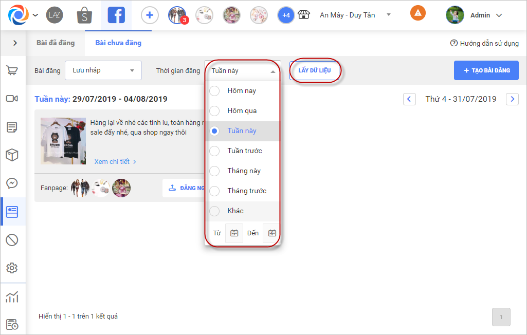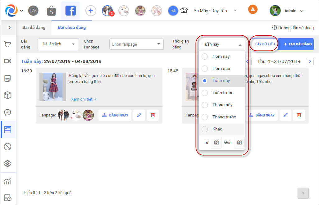 – Nhấn chọn Thời gian đăng để lọc tìm các bài đặt lịch đăng trong khoảng thời gian được chọn và nhấn Lấy dữ liệu