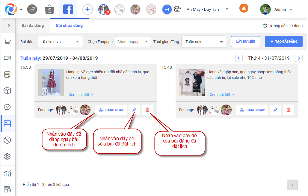 – Trên màn hình danh sách bài đăng đã đặt lịch nhấn chọn Đăng ngay để đăng ngay bài viết, Sửa để sửa lại bài viết đã đặt lịch và Xóa để xóa bài viết đã đặt lịch