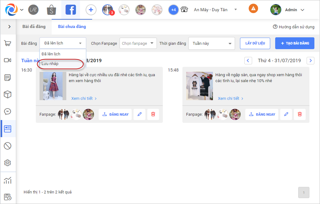 – Tương tự với danh sách các bài đã Lưu nháp: Chọn combo Bài đăng chọn Lưu Nháp