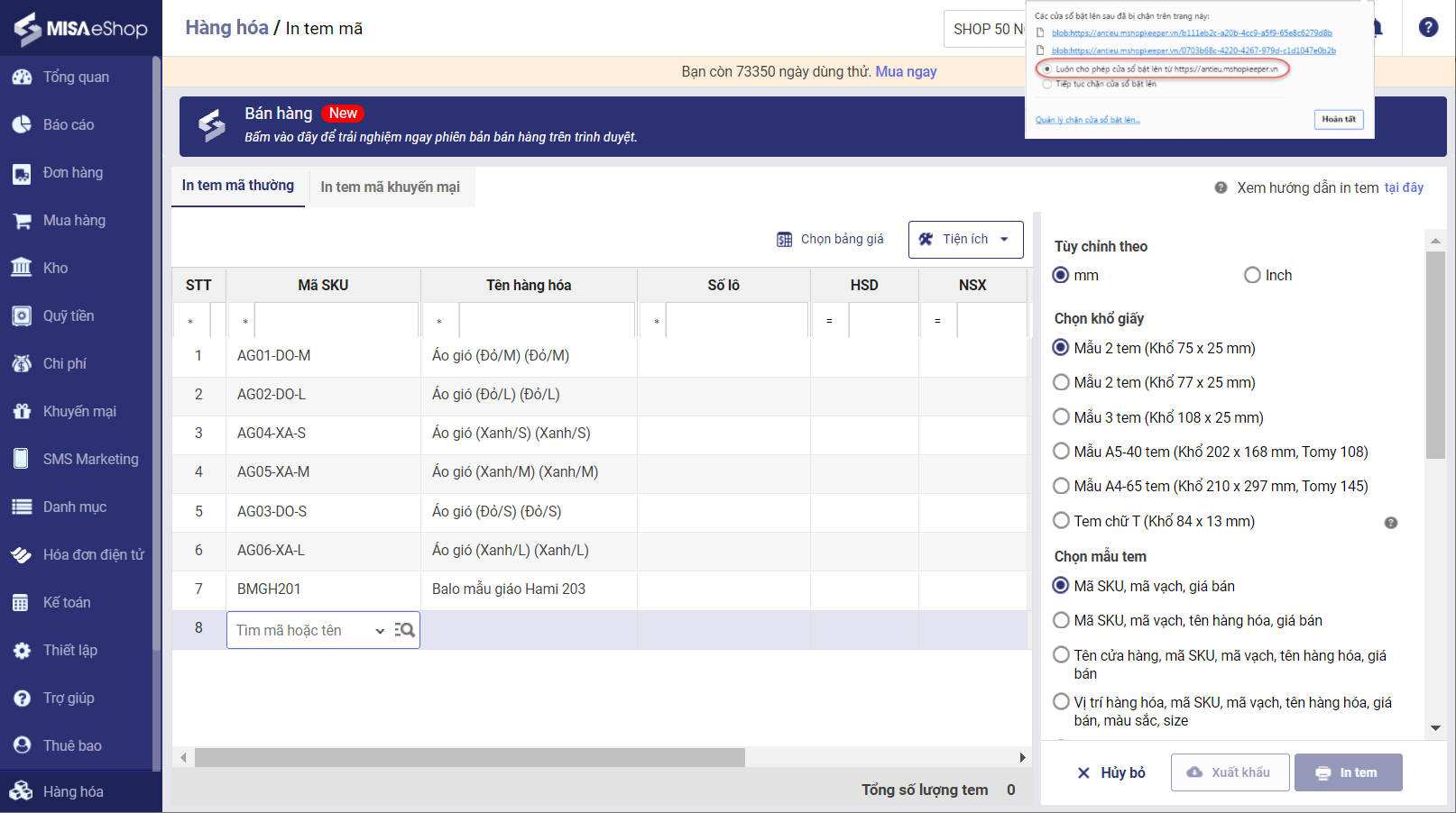 Nguyên nhân có thể do trình duyệt chặn pop-up màn hình In tem mã, để thiết lập, thực hiện như sau:
