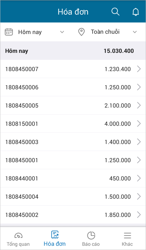 1. Trên ứng dụng quản lý, Quản lý cửa hàng muốn xem danh sách các hóa đơn đã thu trong ngày để theo dõi hoạt động của cửa hàng thuận tiện hơn