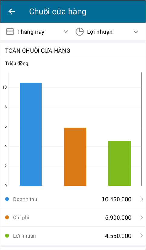 2. Quản lý cửa hàng muốn so sánh được doanh thu, chi phí, lợi nhuận giữa tháng này với tháng trước để đánh giá được hiệu quả hoạt động của tháng, đồng thời tìm hiểu nguyên nhân nếu kết quả hoạt động thấp hơn tháng trước