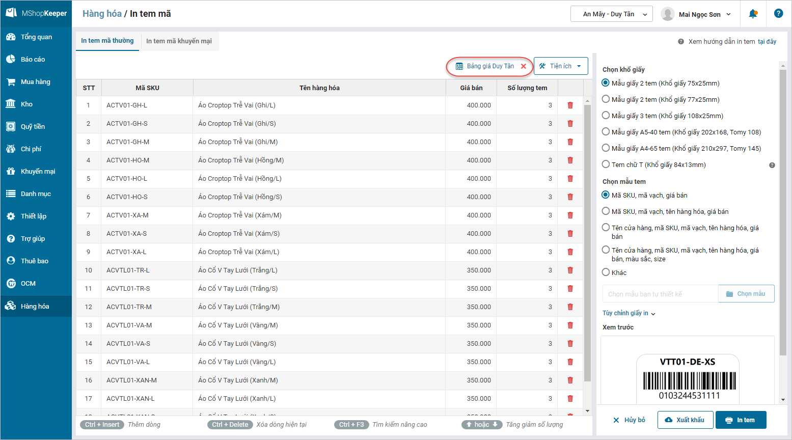 - Trên màn hình In tem mã, lựa chọn bảng giá muốn in tem.