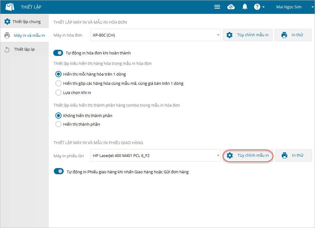 - Tại màn hình Thiết lập/Máy in và mẫu in, nhấn Tùy chỉnh mẫu in trên danh mục Thiết lập máy in và mẫu in giao hàng.