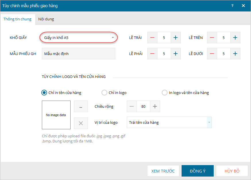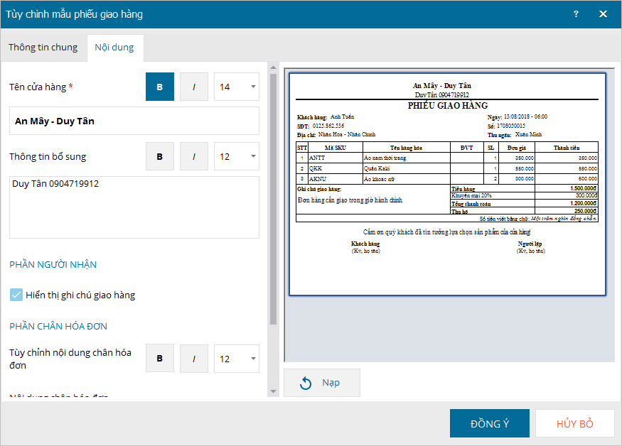 - Thực hiện tùy chỉnh mẫu in giao hàng về các thông tin chung và nội dung trên mẫu in.
