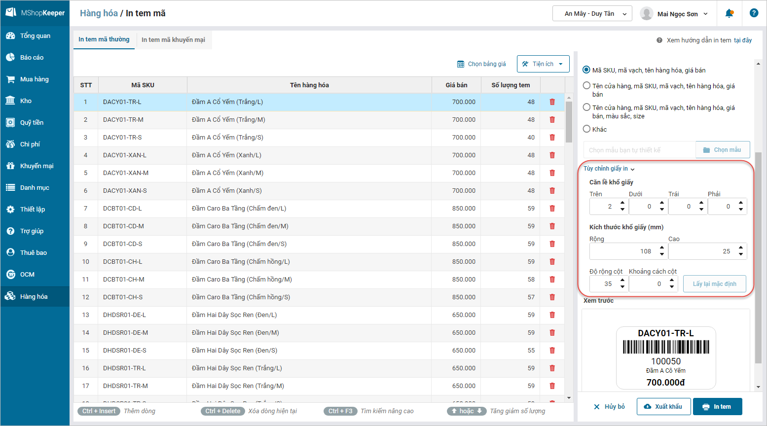 Chi tiết thay đổi: Kể từ phiên bản R12, trên công cụ MShopKeeper chương trình bổ sung thiết lập Tùy chỉnh giấy in, giúp quản lý có thể xem được thông tin kích cỡ của khổ tem và tùy chỉnh lại trong trường hợp khổ giấy in của cửa hàng khác mẫu mặc định trên chương trình.