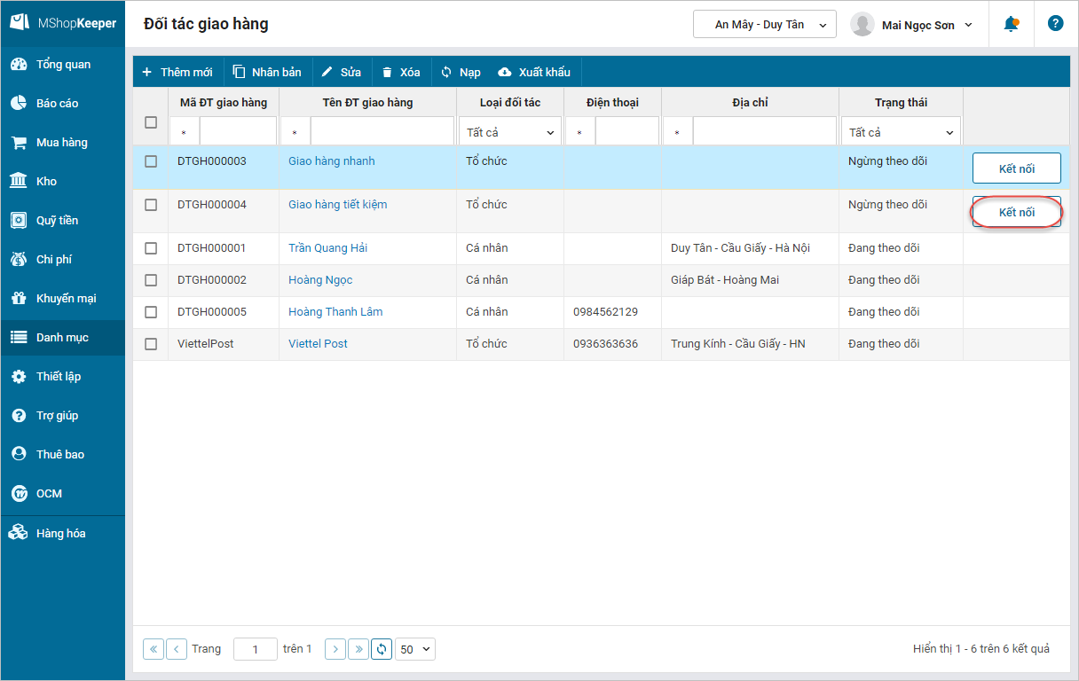 - Trên thông tin đối tác Giao hàng nhanh và Giao hàng tiết kiệm, nhấn Kết nối tương ứng với đơn vị đã đăng ký tài khoản trước đó.