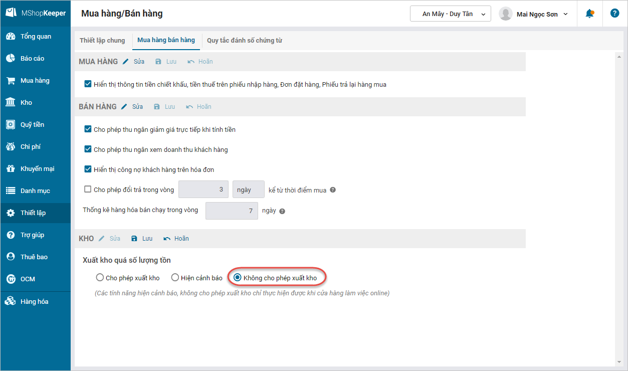 5. Quản lý cửa hàng muốn phần mềm không cho phép xuất kho âm hoặc có cảnh báo khi xuất kho âm để tránh việc kế toán chưa nhập chứng từ nhập kho vào mà thu ngân bán hàng thì kho bị âm dẫn đến giá trị xuất kho không đúng