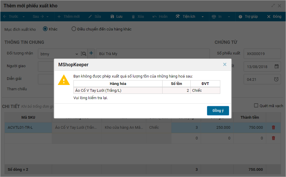 - Hoặc khi kế toán thực hiện xuất kho hàng hóa quá số lượng, chương trình cũng sẽ không phép cất chứng từ.