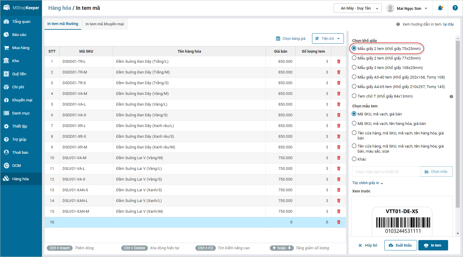 - Trên màn hình In tem mã, quản lý có thể chọn in tem mã khổ giấy 75x22mm.