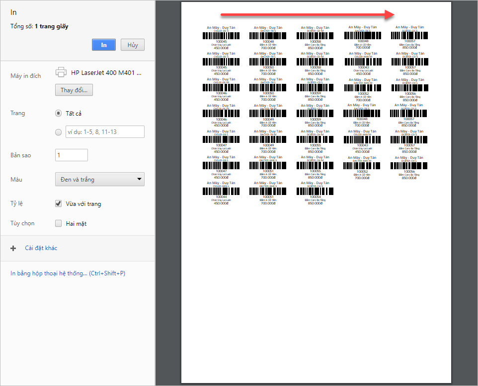 2. Quản lý cửa hàng muốn in tem nhãn trên khổ giấy 75x22mm do loại giấy khổ 75x22mm phổ biến dễ mua hơn tại các cửa hàng bán giấy in tem