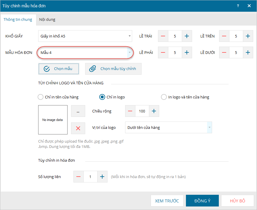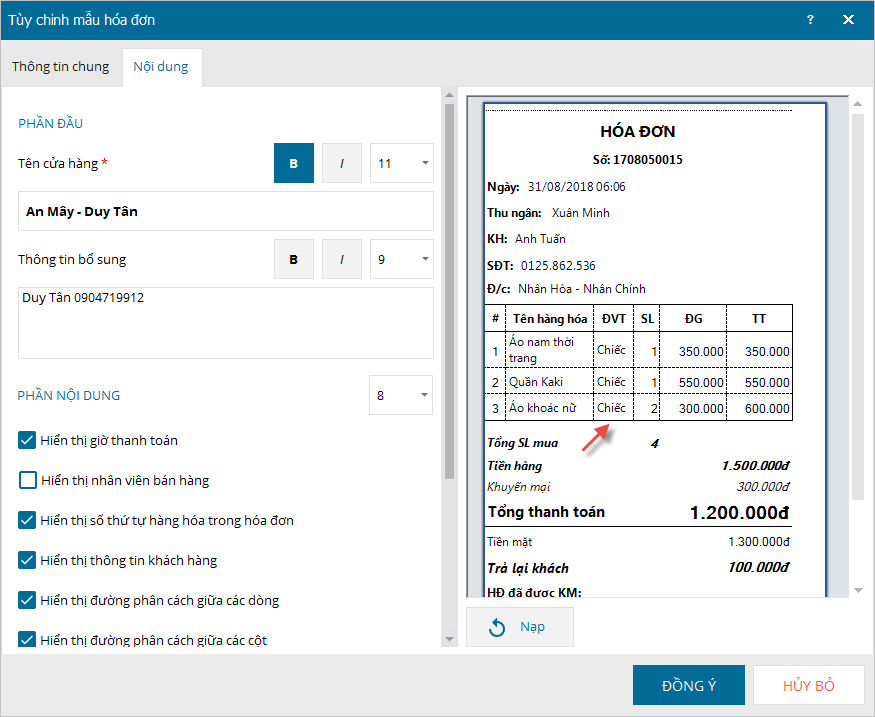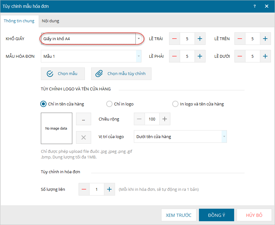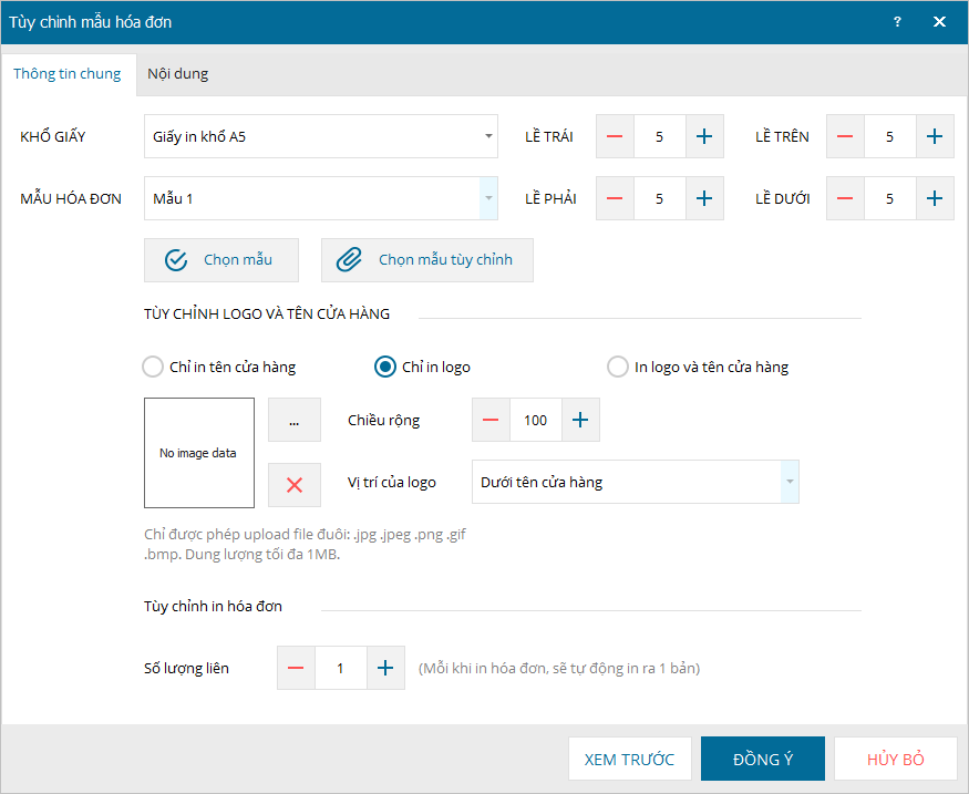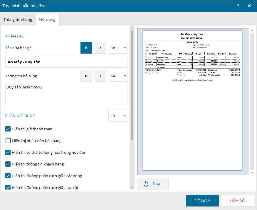 - Thực hiện tùy chỉnh các thông tin chung và nội dung hóa đơn (trên tab Nội dung).