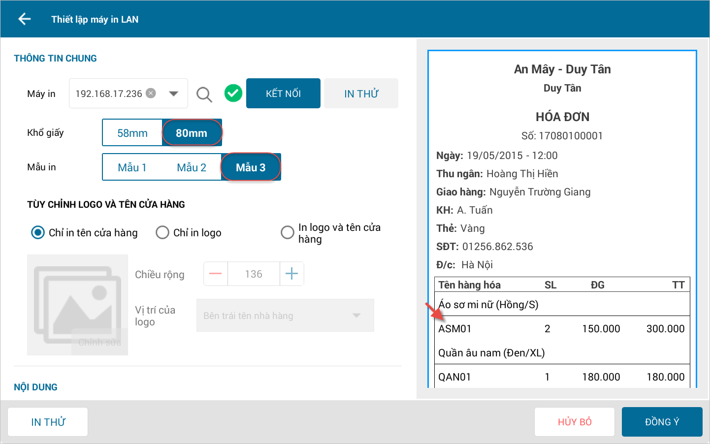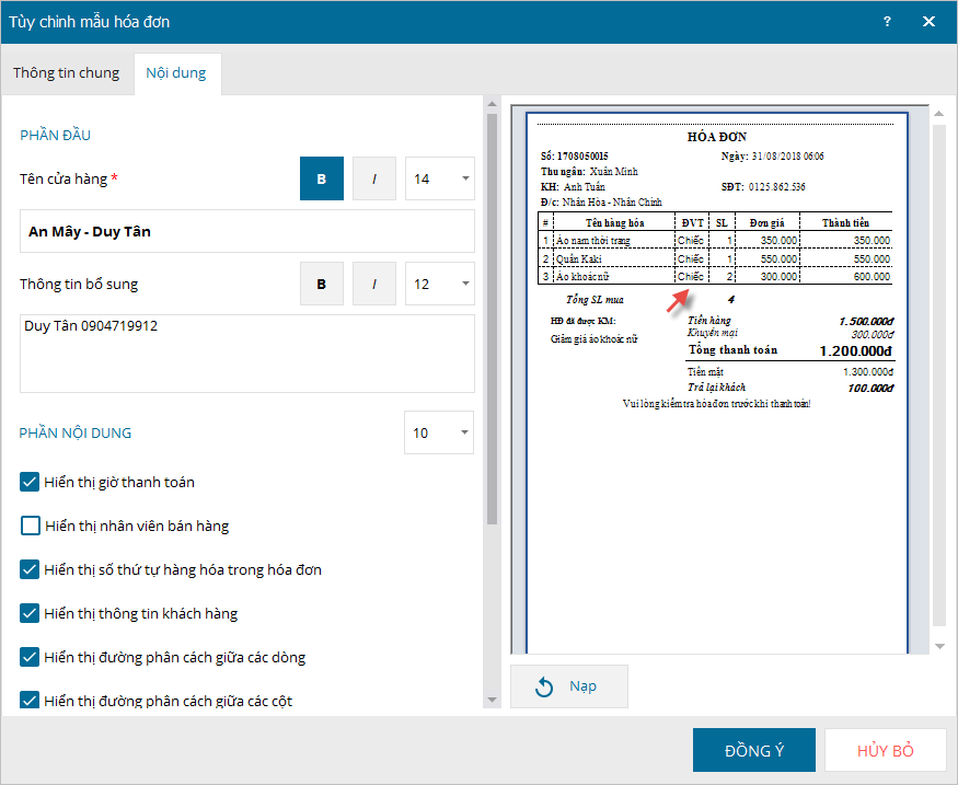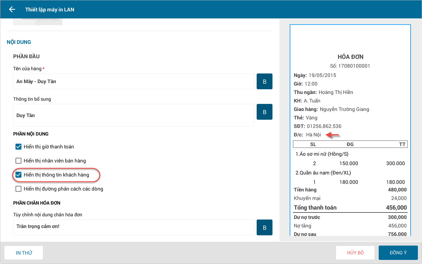 - Khi thiết lập mẫu in hóa đơn, tích chọn Hiển thị thông tin khách lên hóa đơn.