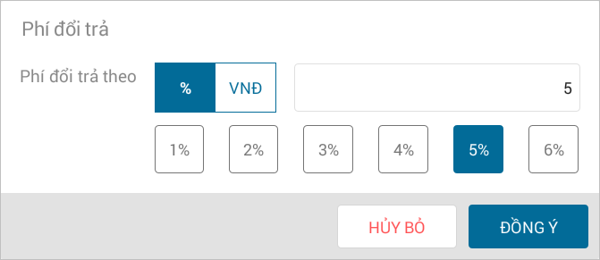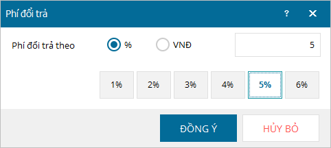 - Nhập % hoặc số tiền phí đổi trả tương ứng, nhấn Đồng ý.