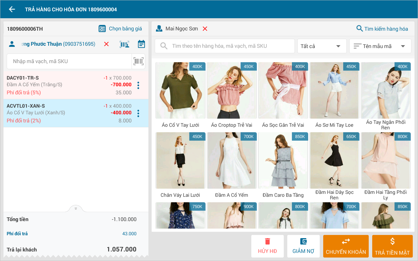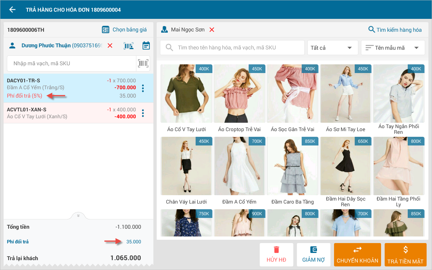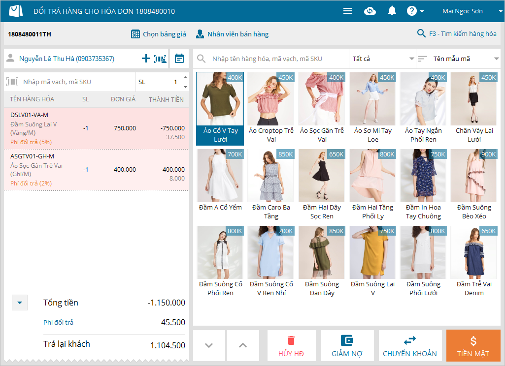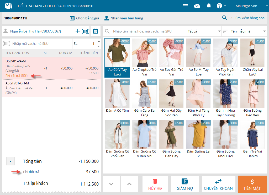 4. Khi ghi nhận hàng đổi trả cho khách, Thu ngân muốn ghi nhận phí đổi trả theo % cho từng hàng hóa (Hiện nay phần mềm chỉ ghi nhận được phí đổi trả theo số tiền cho tổng giá trị đơn hàng)