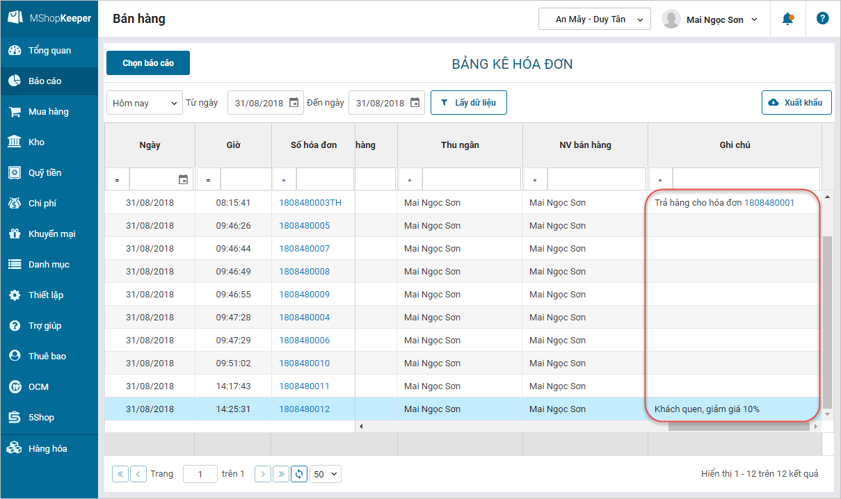 - Khi xem báo cáo Bán hàng/Bảng kê hóa đơn, chương trình sẽ hiển thị ghi chú thu ngân ghi nhận trên hóa đơn và ghi chú tự sinh với các hóa đơn đổi trả.