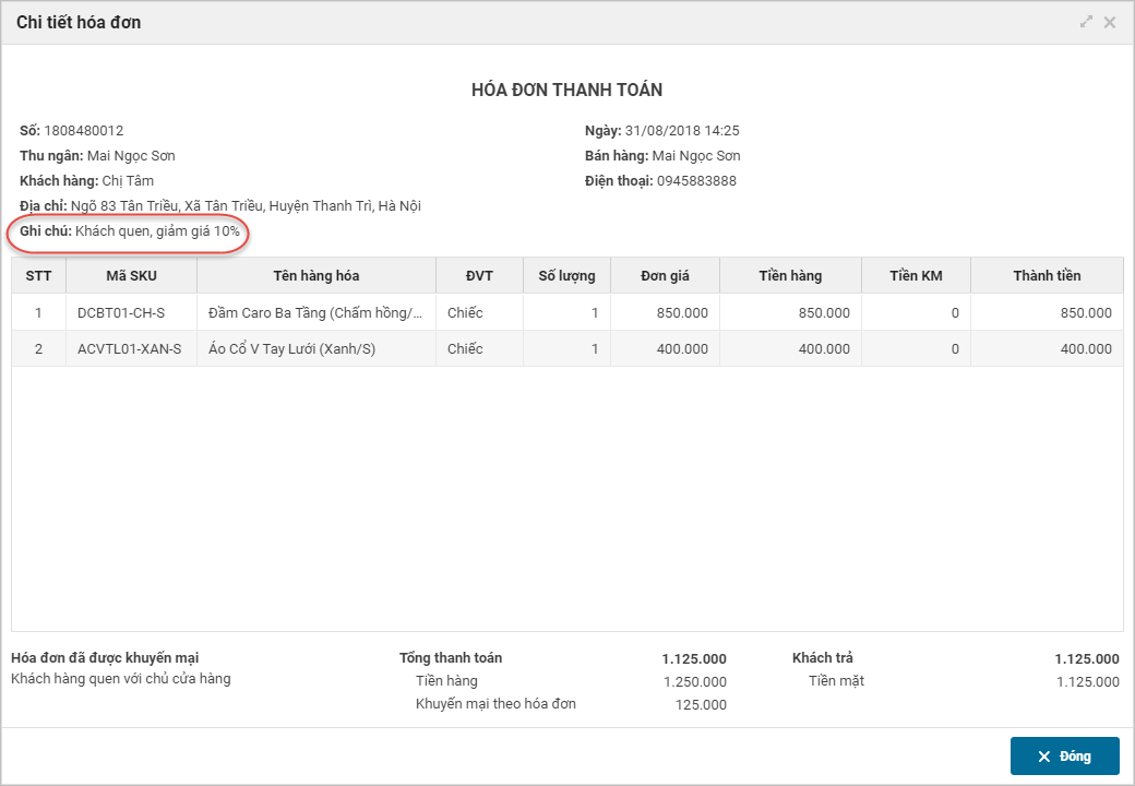 - Chương trình cũng sẽ hiển thị ghi chú khi xem chi tiết hóa đơn.