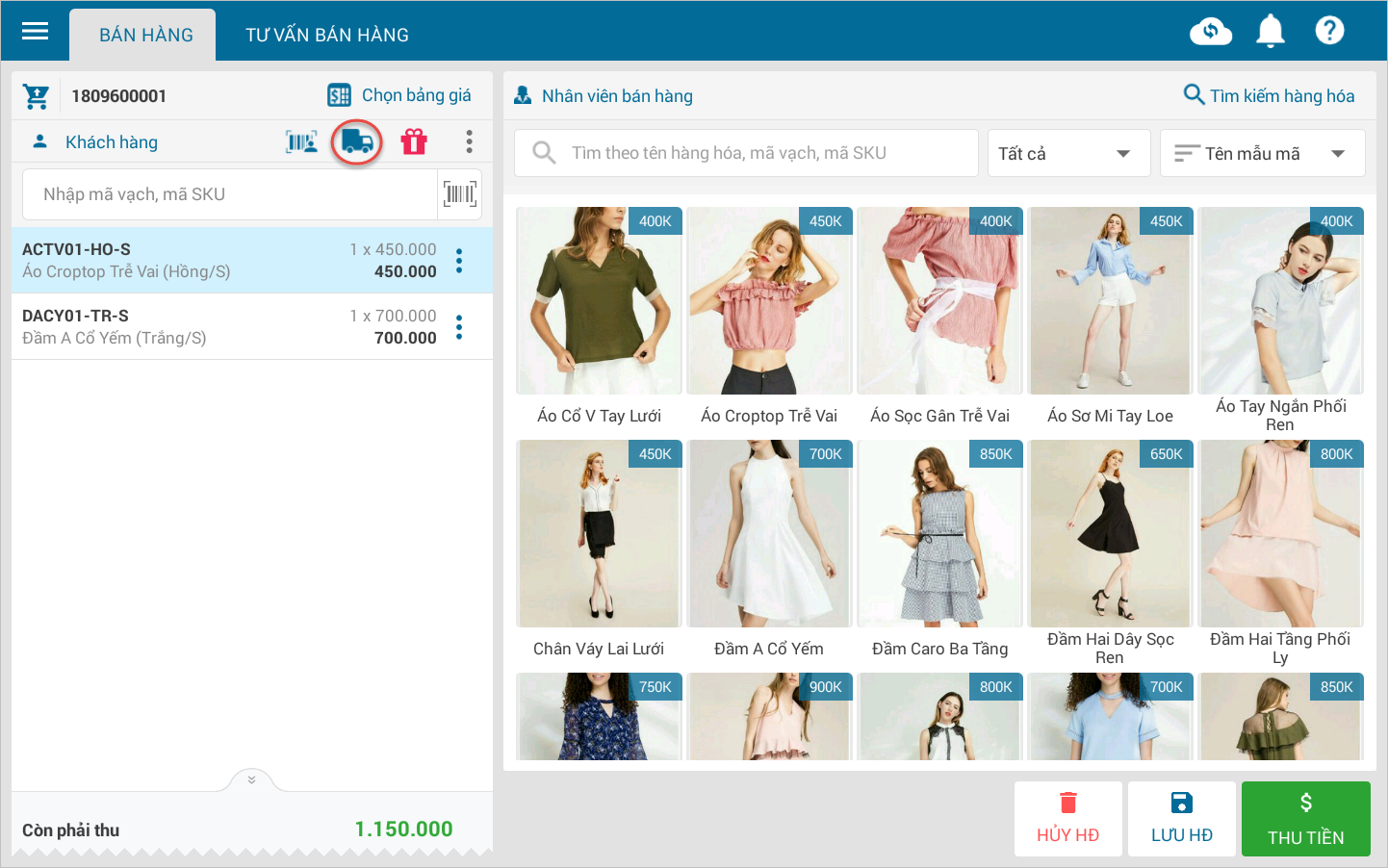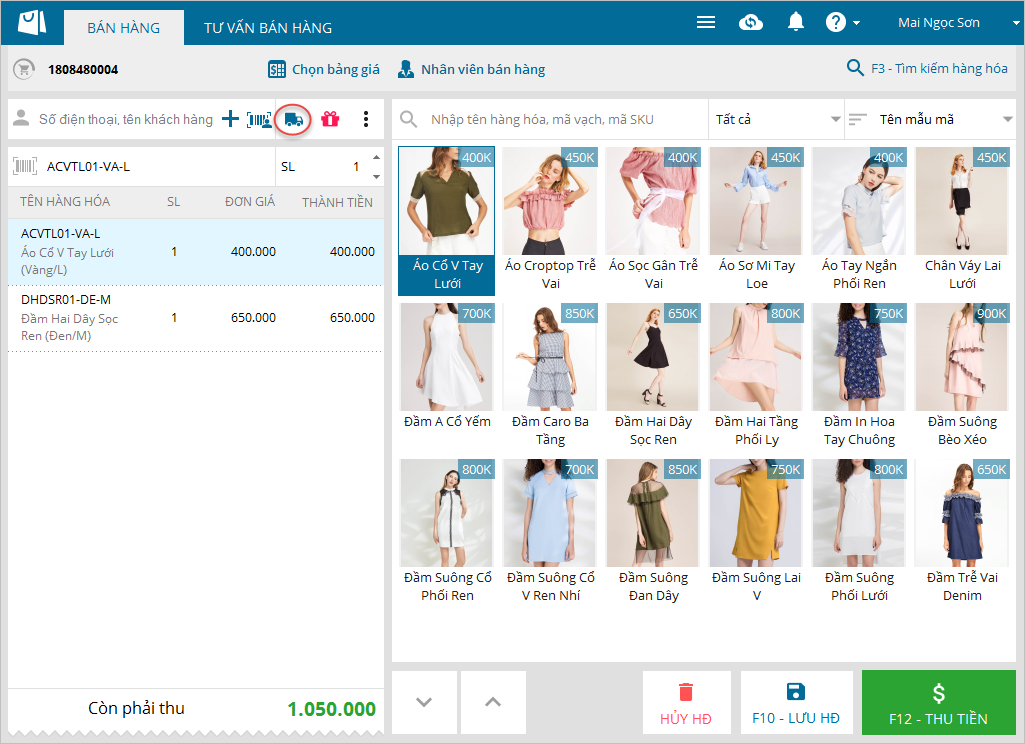 - Trên màn hình Bán hàng, thực hiện chọn các hàng hóa khách mua.