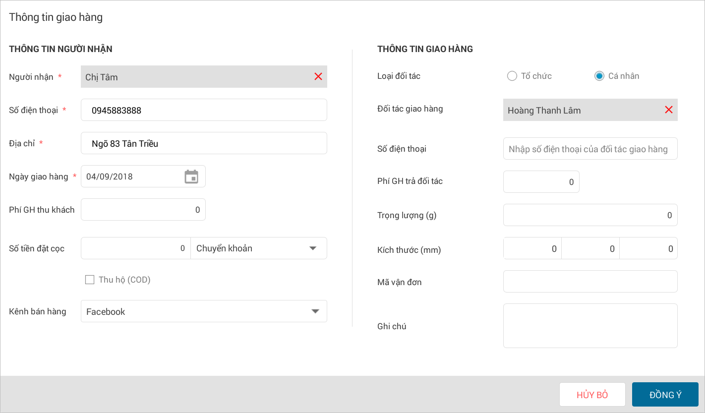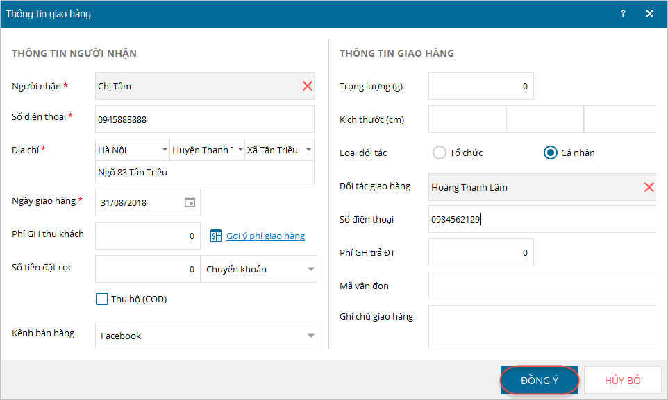 và ghi nhận thông tin giao hàng cho khách.