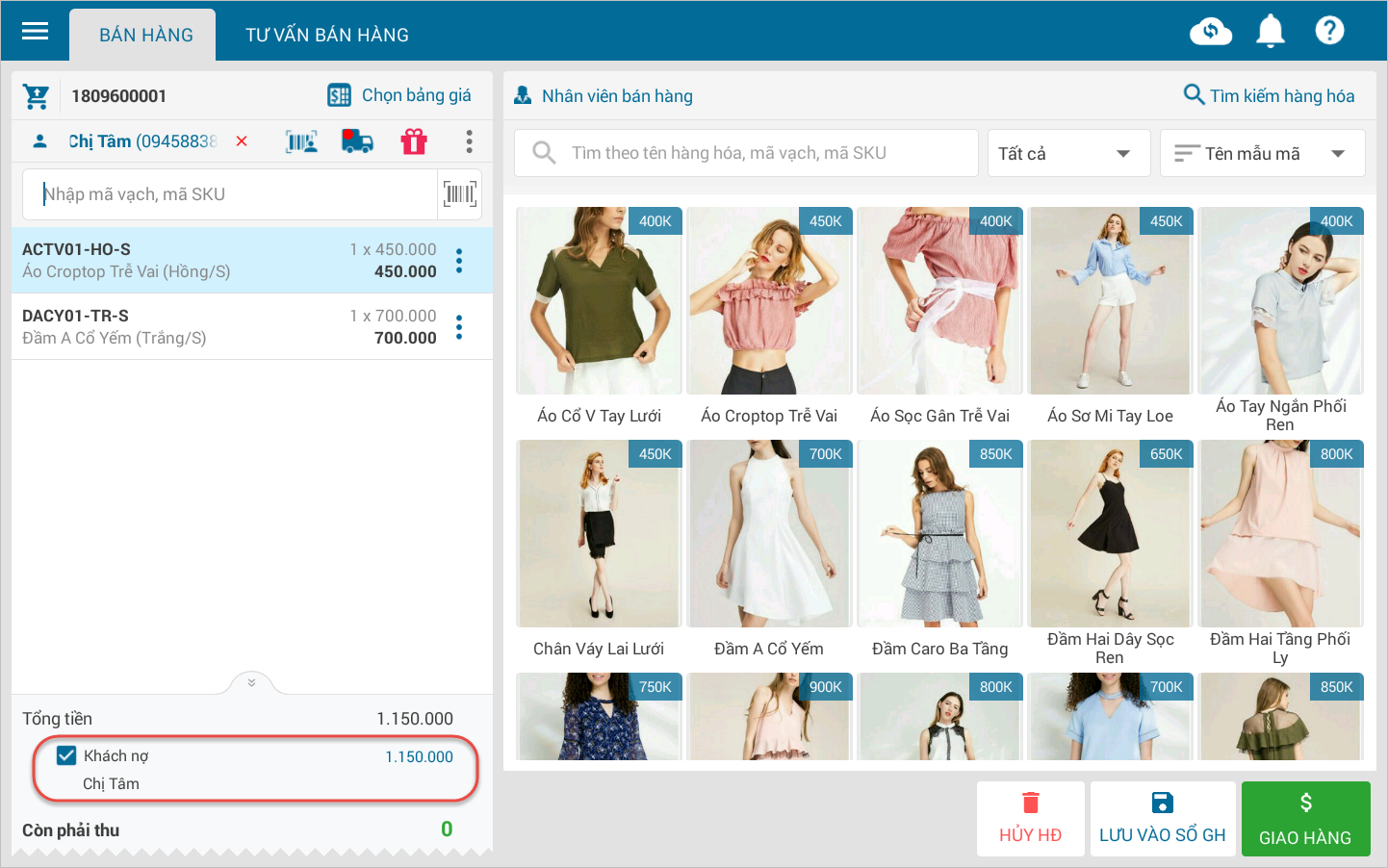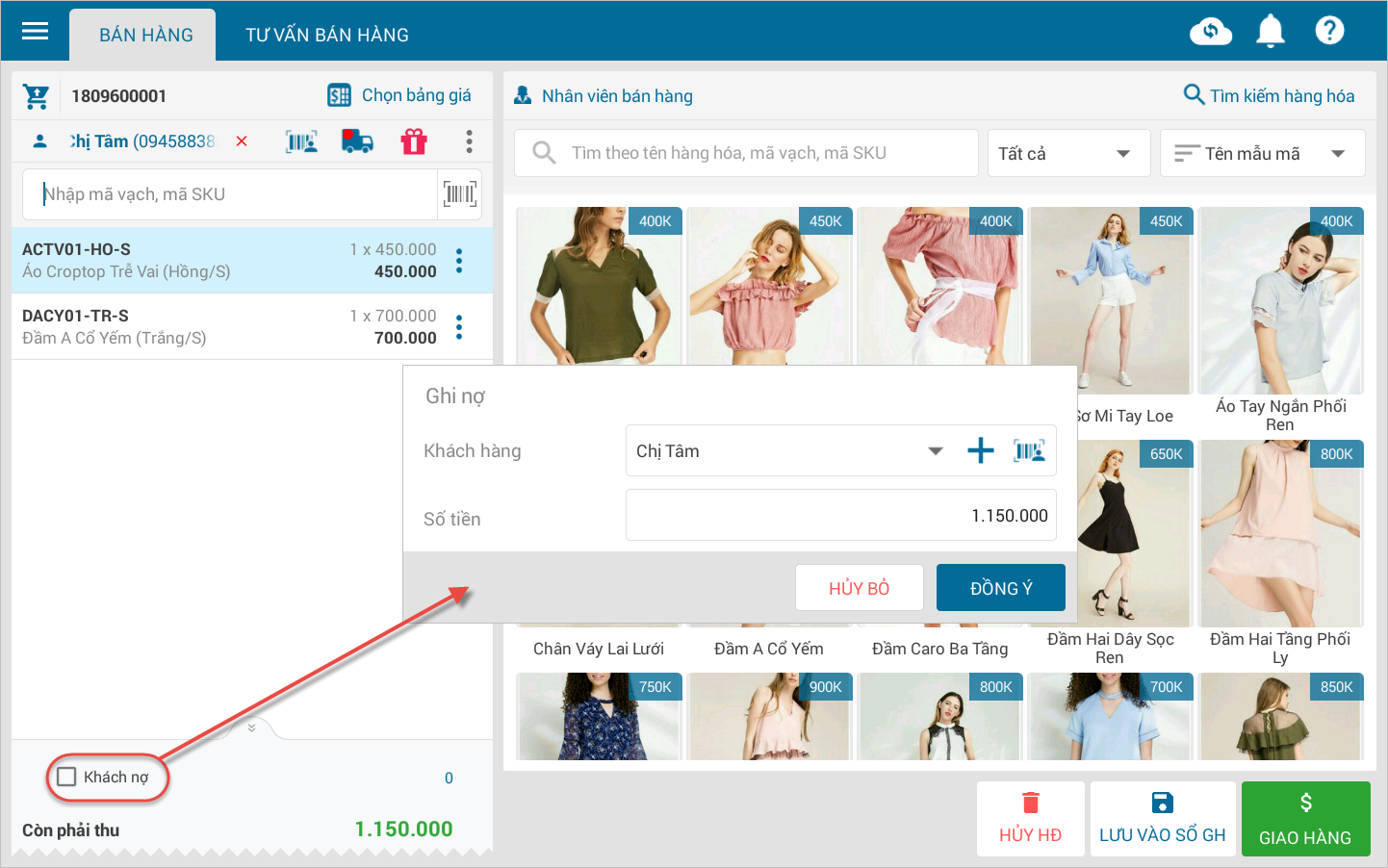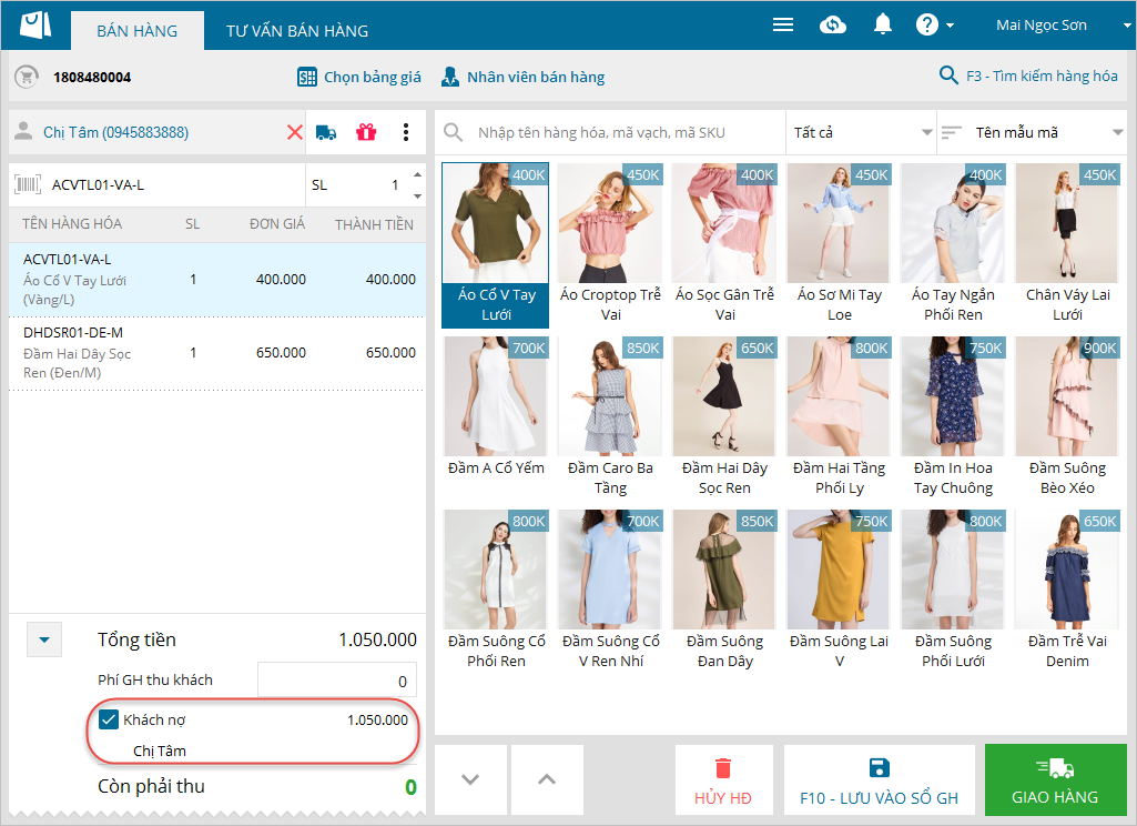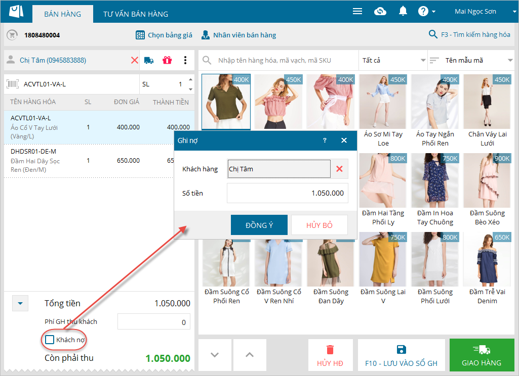 - Trường hợp cửa hàng cho khách nợ, tích chọn thông tin Khách nợ.