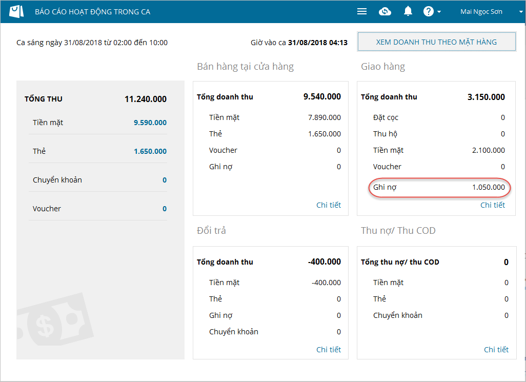 - Sau khi hoàn thành đơn giao hàng. khoản tiền cho khách nợ sẽ được ghi nhận trên các báo cáo trên chương trình, giúp quản lý dễ dàng theo dõi doanh thu của cửa hàng.
