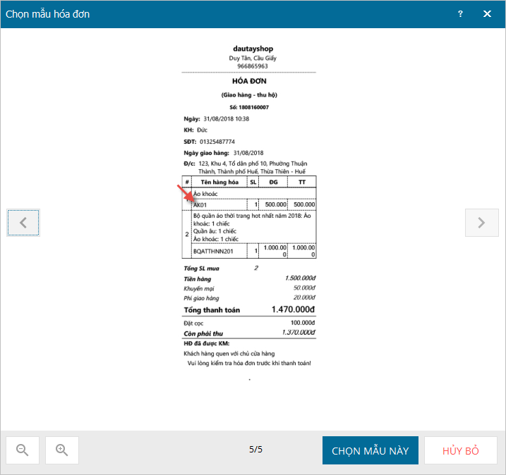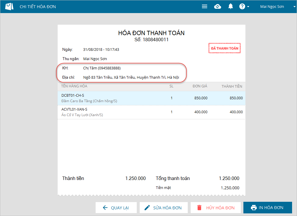 - Trên hóa đơn sẽ hiển thị thông tin địa chỉ của khách hàng.