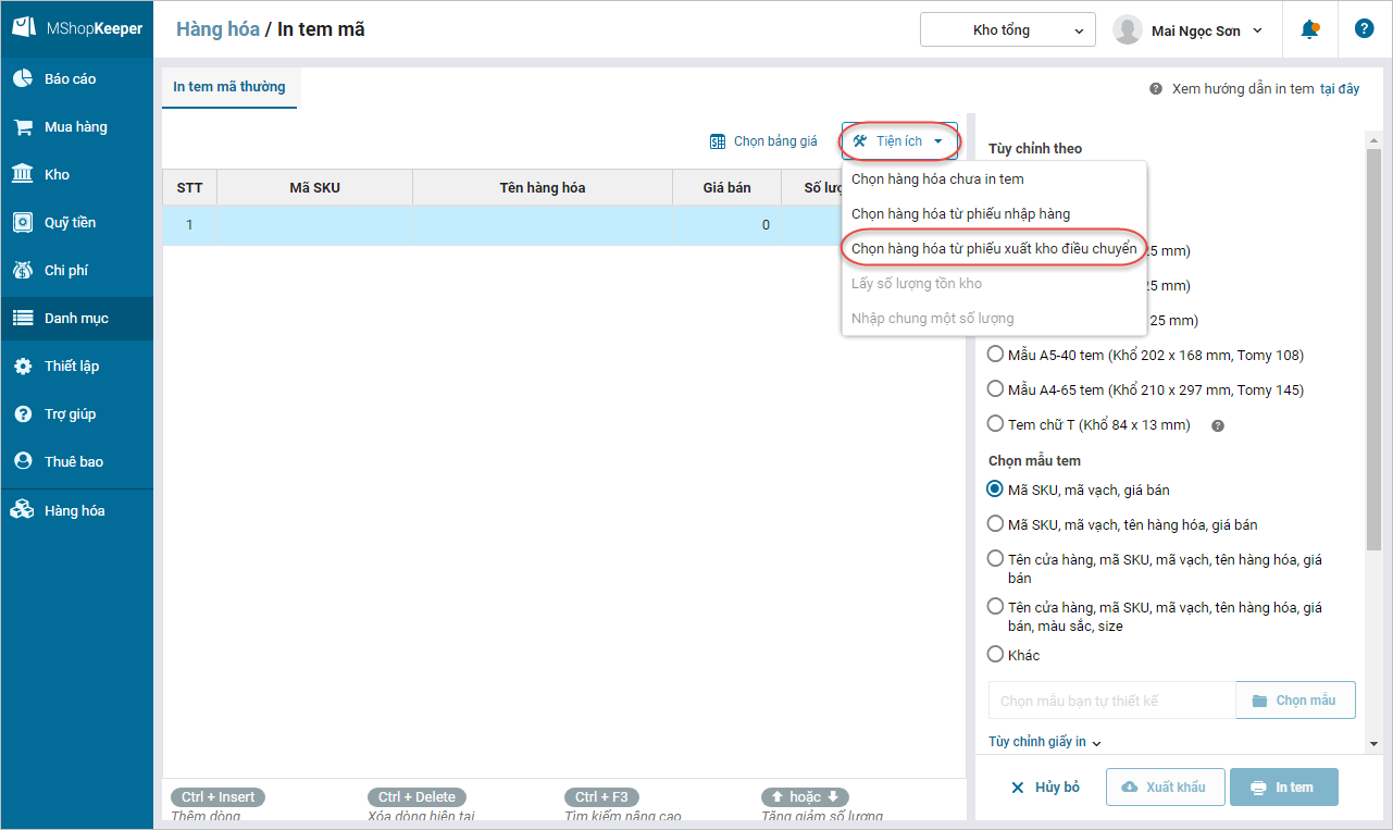 3. Khi chuyển hàng hóa từ kho Tổng về các chi nhánh, Kế toán kho tổng muốn in tem mã của các hàng xuất đi để dán lên các hàng hóa đó (Chi nhánh chỉ nhận hàng về và bán chứ không phải dán tem mã cho hàng hóa)
