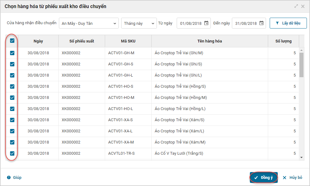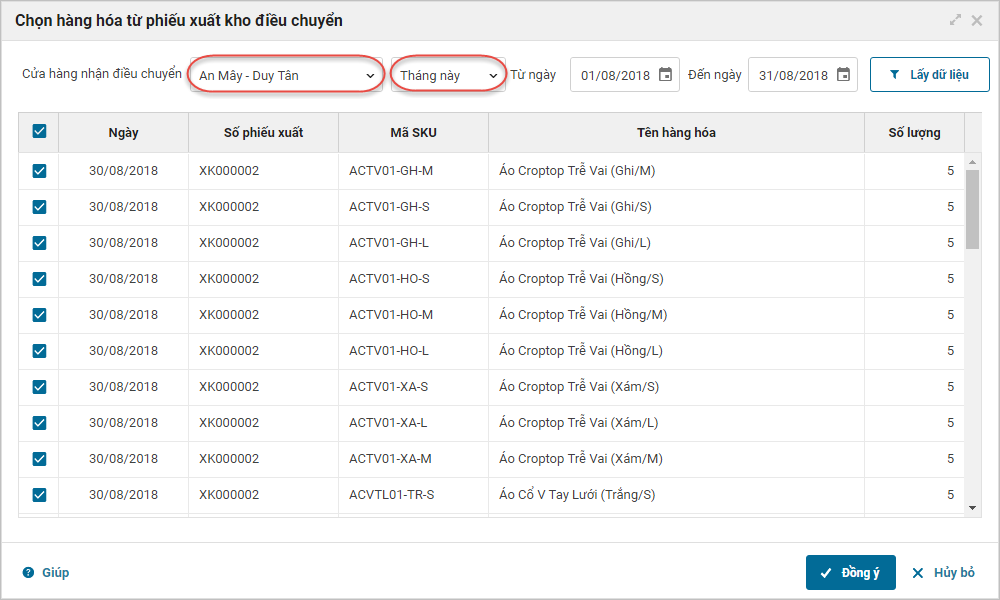- Chọn thời gian lập phiếu điều chuyển, nhấn Lấy dữ liệu.