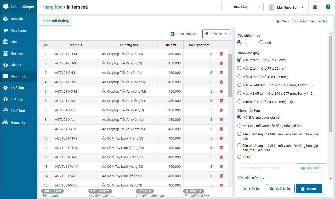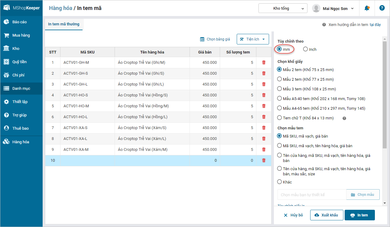 - Thực hiện in tem mã hàng hóa. Tham khảo hướng dẫn in tem tại đây.