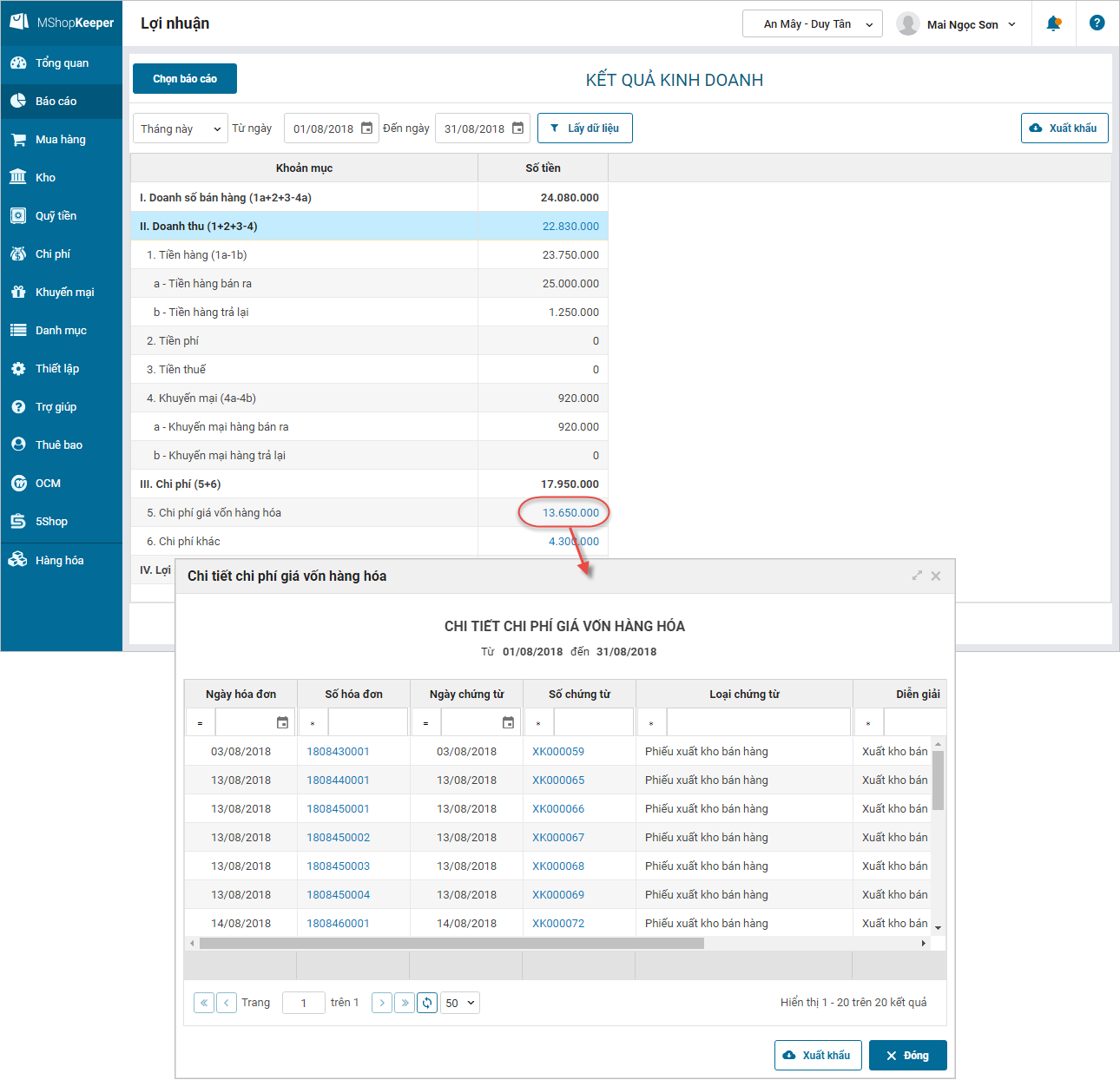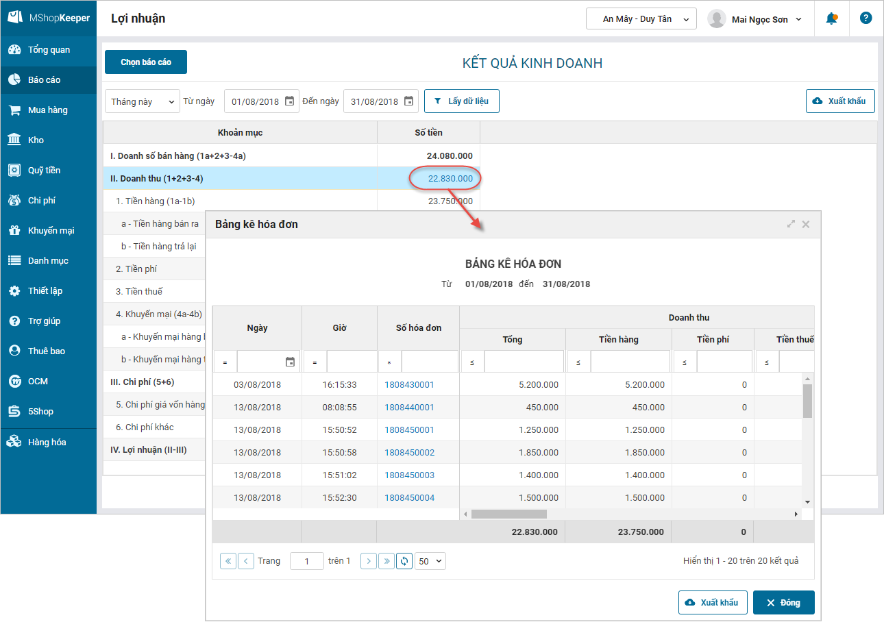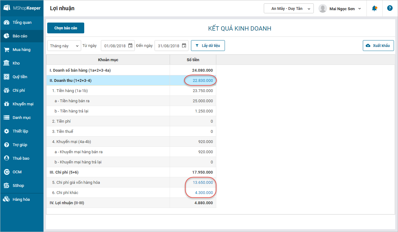 6. Trên báo cáo lợi nhuận\kết quả kinh doanh, Quản lý cửa hàng muốn biết chi tiết số tiền Doanh thu, Chi phí giá vốn hàng hóa, Chi phí khác để kiểm tra, đối chiếu