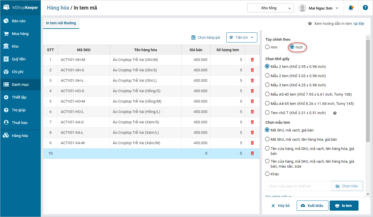 8. Bổ sung thêm thông tin kích cỡ theo inch của tem nhãn