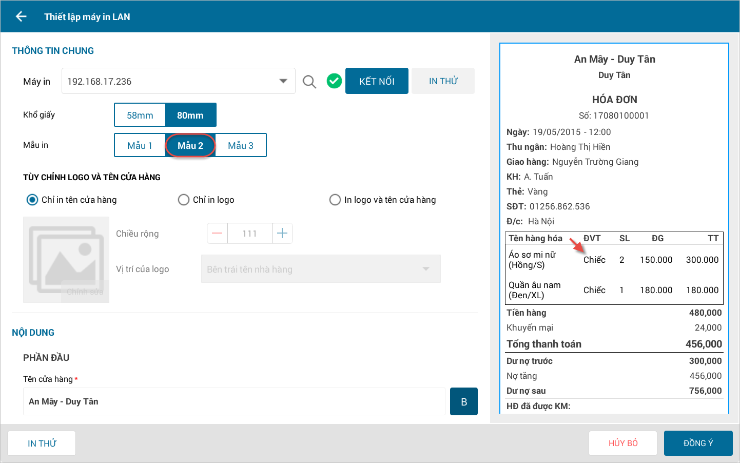 - Trên mẫu in khổ 80mm, chương trình bổ sung mẫu in số 2 có hiển thị đơn vị tính hàng hóa.