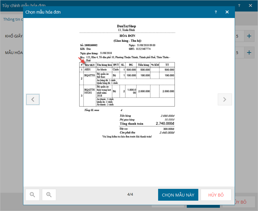 2. Ở cửa hàng bán buôn cho đại lý, Quản lý cửa hàng muốn hóa đơn hiển thị mã SKU để làm căn cứ đối chiếu khi khách đến đổi trả hàng