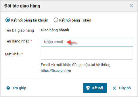 2. Khi thực hiện kết nối với đơn vị vận chuyển, Quản lý cửa hàng muốn chương trình ghi rõ việc chỉ được nhập tên tài khoản kết nối bằng email để không nhập sai tài khoản theo số điện thoại