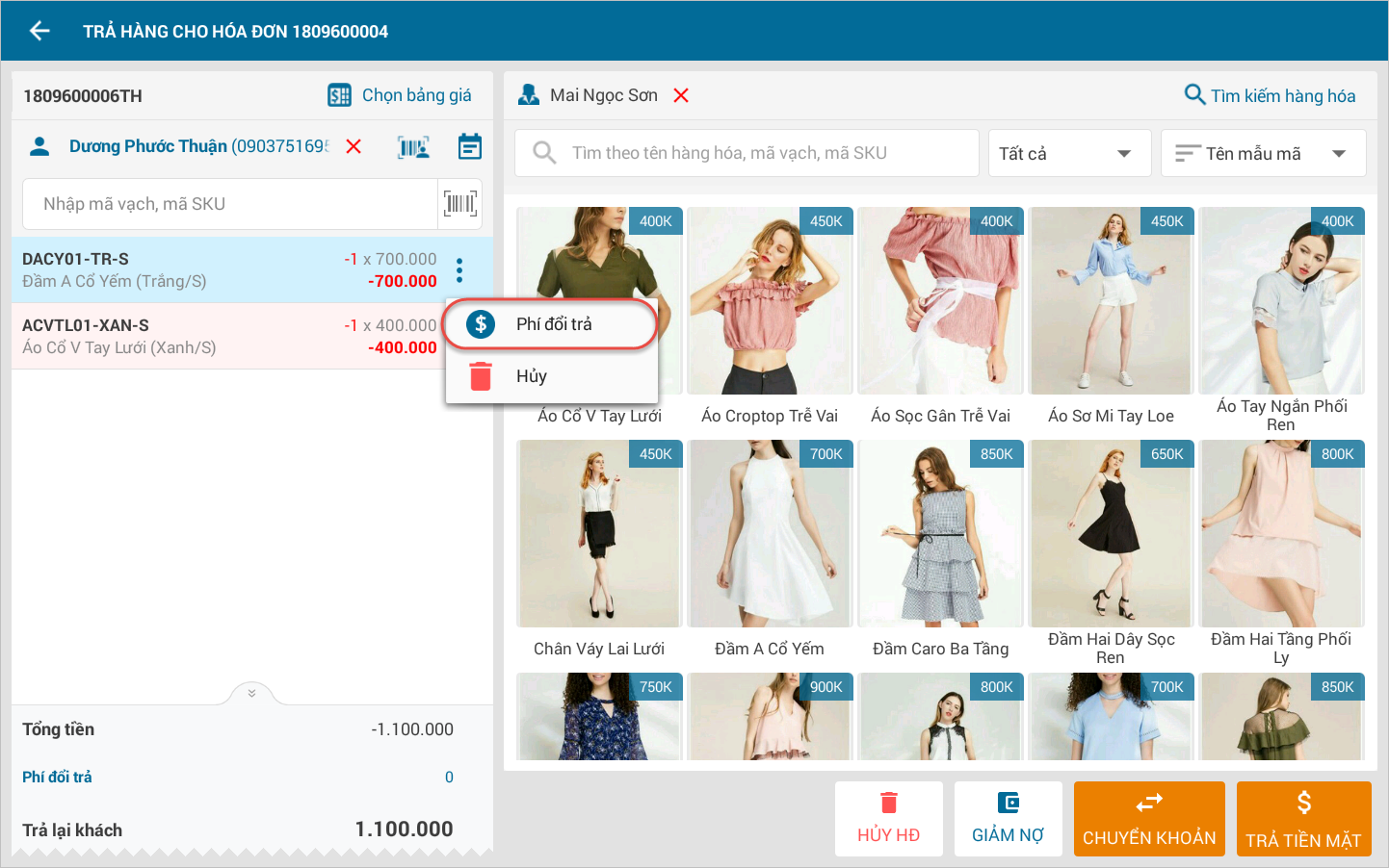 - Tại màn hình Đổi trả hàng hóa, nhấn chuột phải tương ứng với hàng hóa có tính phí, chọn Phí đổi trả.