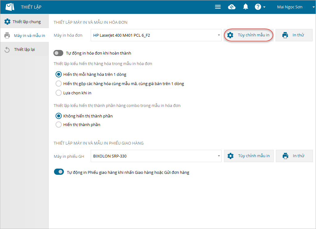 , chọn Thiết lập. - Trên tab Máy in và mẫu in, nhấn Tùy chỉnh mẫu in.