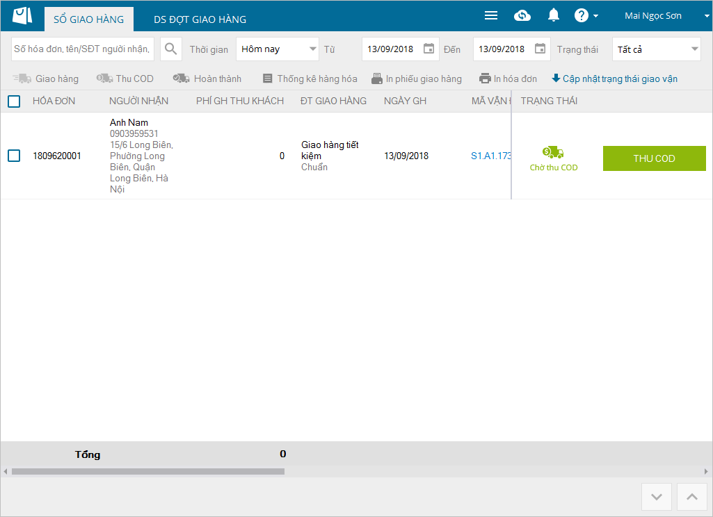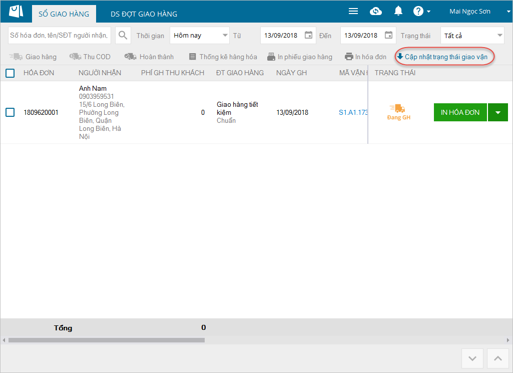 - Trên màn hình Sổ giao hàng, với các đơn hàng từ đối tác Giao hàng nhanh, Giao hàng tiết kiệm không tự cập nhật trạng thái, nhấn chọn chức năng Cập nhật trạng thái giao vận để tự cập nhật.