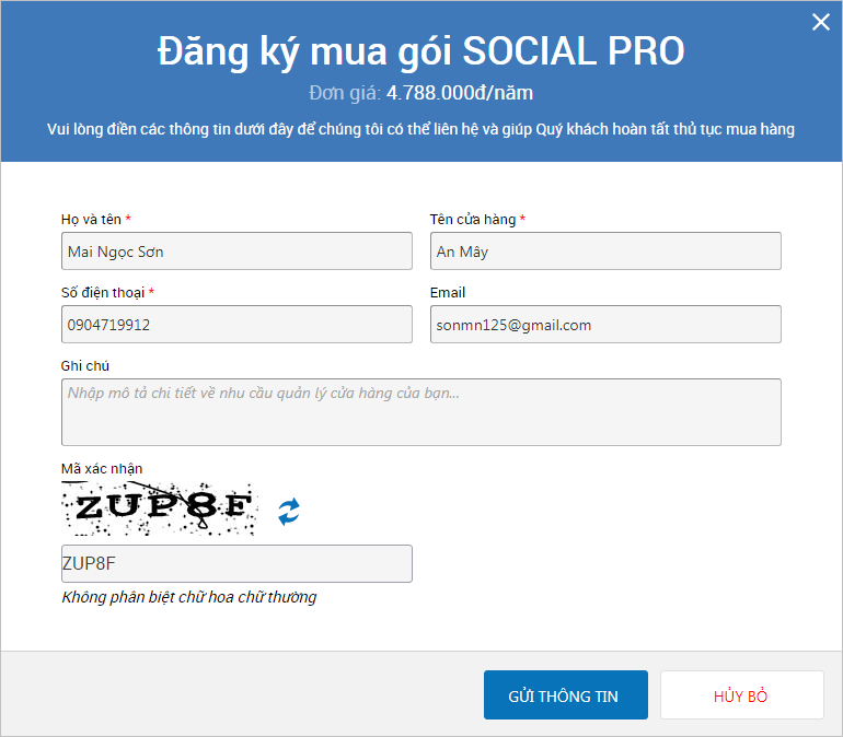 - Nhập các thông tin liên hệ mua hàng, nhấn Gửi thông tin.