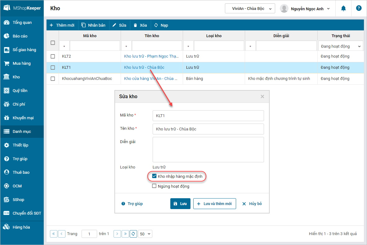 • Nhấn chọn kho lưu trữ muốn thiết lập làm kho nhập hàng mặc định.