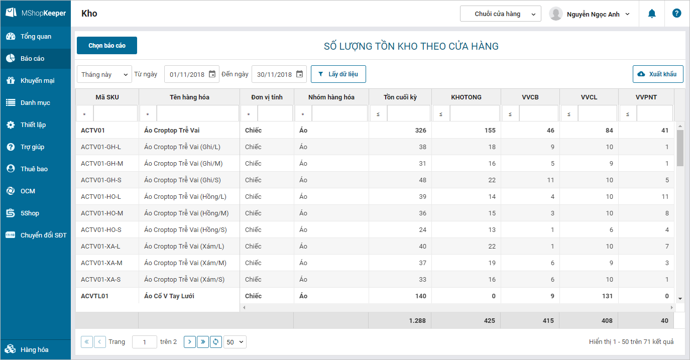 • Lựa chọn báo cáo Số lượng tồn kho theo cửa hàng.
